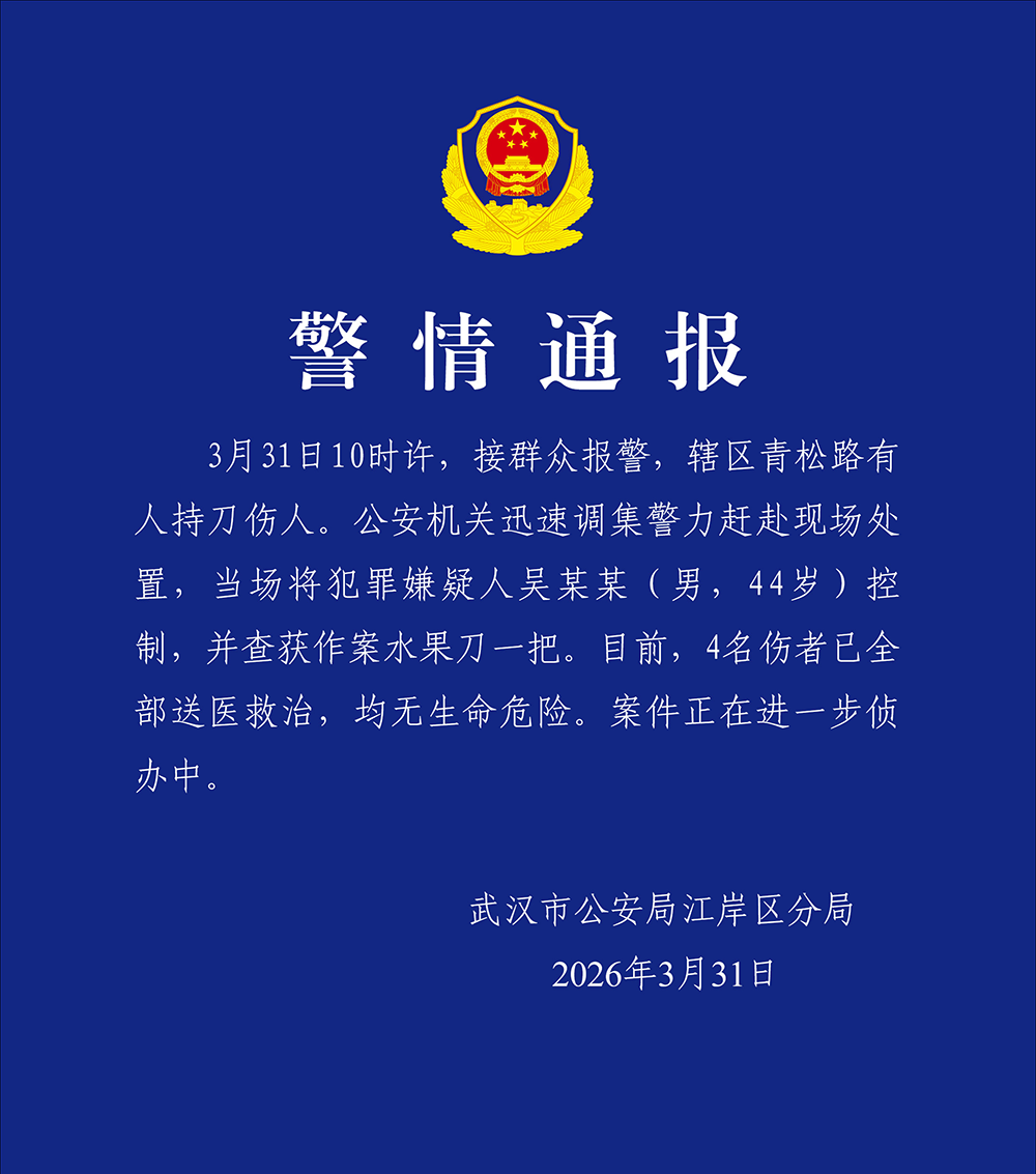 3月31日,武汉市公安局江岸区分局发布警情通报:3月31日10时许,接群众报警,辖区青松路有人持刀伤人。公安机关迅速调集警力赶赴现场处置,当场将犯罪嫌疑人吴某某(男,44岁)控制,并查获作案水果刀一把。目前,4名伤者已全部送医救治,均无生命危险。案件正在进一步侦办中。